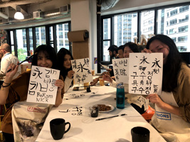 最初のお手本として、永字八法を使い、説明を行い、後は、一人一人を見て回り、中には、画仙紙の大きさに挑戦したいという参加者もいたので、画仙紙にお手本を書くことも行いました。参加者は全員初心者、アメリカ、インド、韓国、中国等々、様々な国からの人が参加しました。みなさんが初心者で、書道の基本は知らないものの、自分の書きたい字を自分の思うように表現して書いており、私が参加者から学んだ部分も大きかったです。