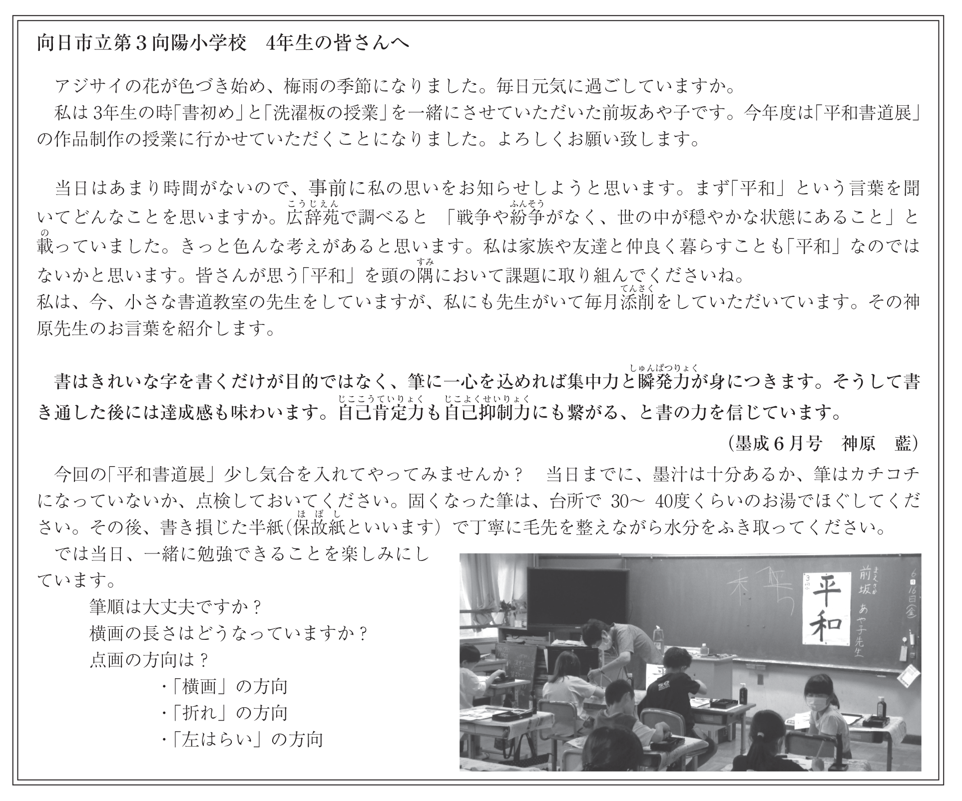 今回は、昇段級試験の優秀作品に選んでいただきありがとうございます。とてもうれしかっ たです。二年生の時に、友達といっしょに入り、最初は、筆で書くことが難しかったけれど、先生にほめられると、うれしくて、習字がどんどん好きになりました。これからも、「とめ」「はね」「はらい」などのポイントに気を付けて、ていねいに字を書きたいと思います。